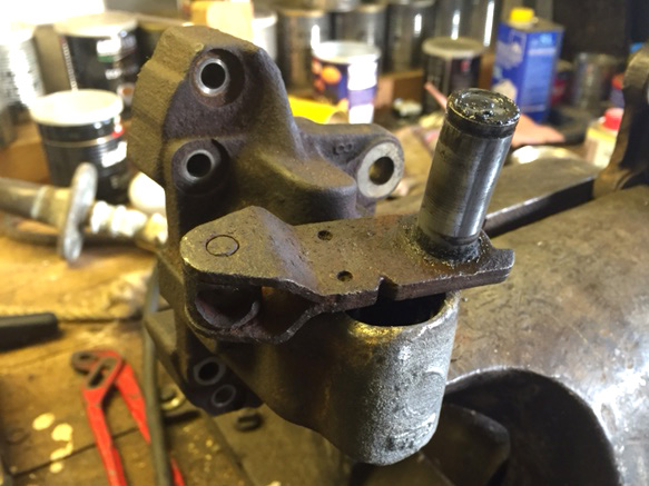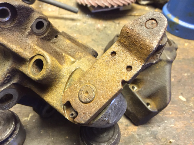 Nun aber zu meinem Problem. Ich habe die hinteren Sättel soweit wie abgebildet auseinanderbekommen. Zum "gelb verzinken" müsste aber noch der Hebel der Handbremsbetätigung ab, und daran scheiter ich. Vermutlich ist er auf die Welle (wahrscheinlich Vielzahn?) aufgepresst, die im Innenleben den Kolben bewegen lässt... Vis á vis der Welle ist ein Stopfen. Vermutlich eingeschlagen?!