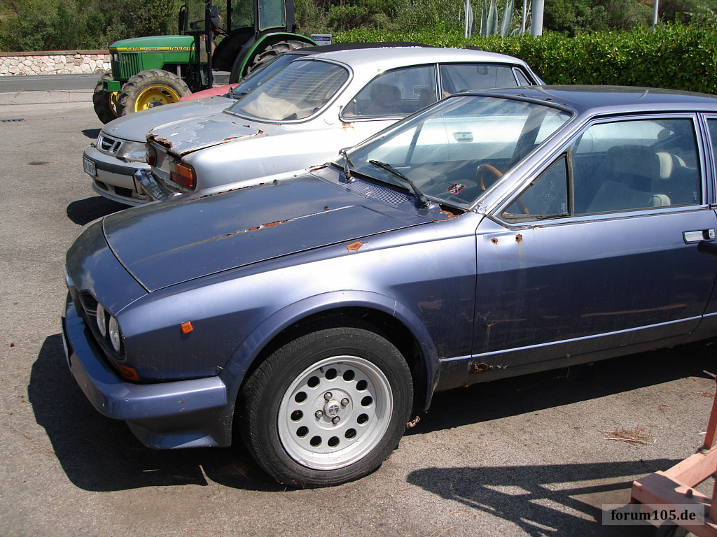 Beide Autos scheinen interessanterweise in Deutschland gelaufen zu sein, bei der Alfetta waren anhand Schweizvignette und TÜV Siegel als vermutlich letztes Fortbewegungsjahr 1990 auszumachen. Wäre spannend zu wissen, wie die Autos dorthin gekommen sind. Ich war leider über die Mittagszeit dort, und somit war niemand anzutreffen, laut Werkstattschild hätte "man" deutsch gesprochen (io non parlo italiano).